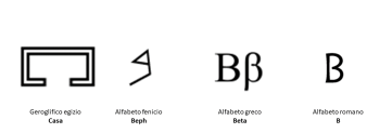 La lettera B come la conosciamo deriva dalla beph, lettera dell’alfabeto fenicio. La sua forma assomiglia allo geroglifico egizio della casa. Successivamente la beph è stata capovolta diventando la beta nell’alfabeto greco prima di assumere la sua forma definitiva nell’alfabeto romano. Guarda sempre verso destra.