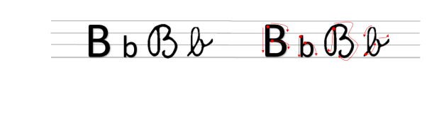Per la B in corsivo minuscolo, si realizza con un unico tratto in 2 tempi. Sali dal rigo del prato al rigo del cielo e rivieni realizzando un cappio quindi risali realizzando un gancio sulla destra e disegna una coroncina.